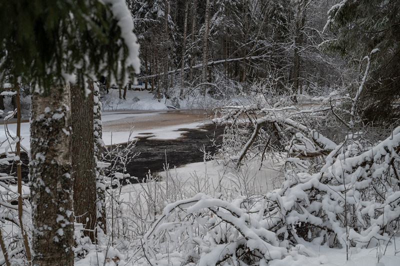 雪中溪流蜿蜒穿林