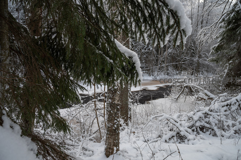 翠绿的松针上堆满蓬松白雪,如天然的帘幕般垂下,隐约可见其后流淌的溪水与远处雪覆的林木,构成一幅动静相宜的冬日水墨画。