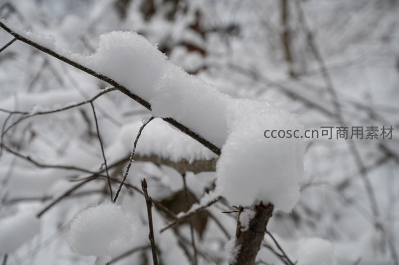特写镜头捕捉到细小枝条上堆积的蓬松雪花,每一粒晶体都清晰可见,展现大自然在寒冷中创造的精致与纯净。