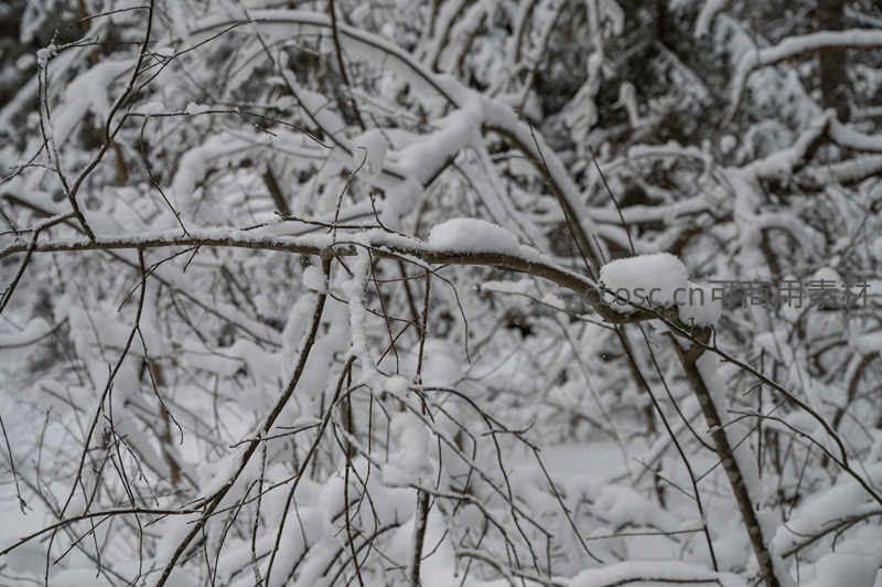 纵横交错的枯枝被厚雪温柔包裹,形成一幅天然的水墨画,灰白相间中透出冬日特有的沉静与诗意。