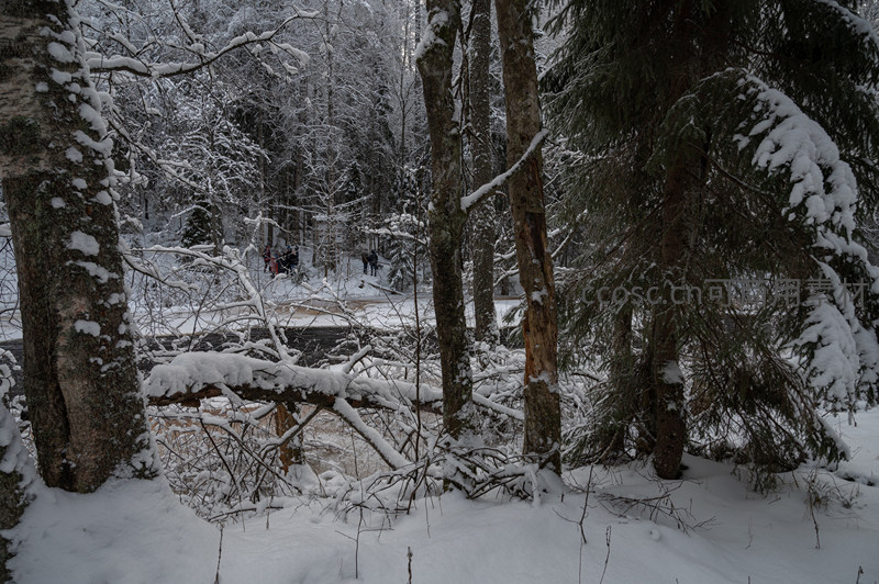 透过被雪压弯的树枝望去,远处隐约可见行人踏雪而行,为这片寂静的雪林注入了温暖的人文气息与生活痕迹。