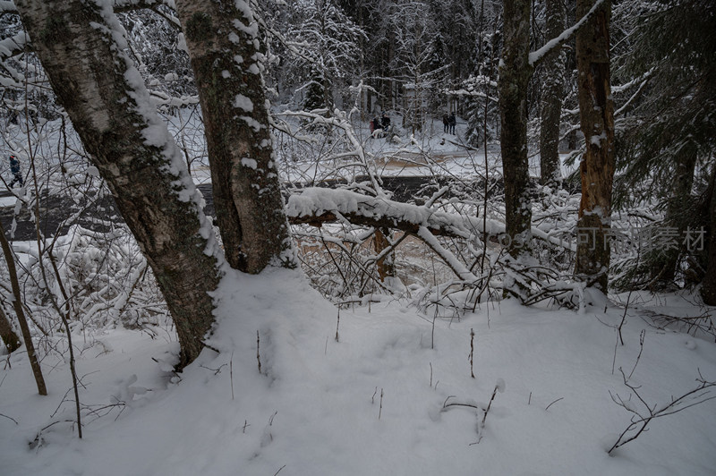 皑皑白雪覆盖整片森林,粗壮树干与细枝交错,远处隐约可见行人身影,营造出宁静而神秘的冬日氛围。