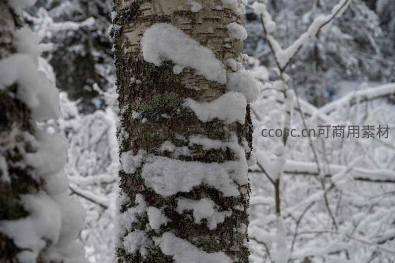 镜头聚焦于白桦树皮上积雪的形态,斑驳的树皮与柔软的白雪形成强烈对比,传递出冬日森林中沉静而诗意的美感。