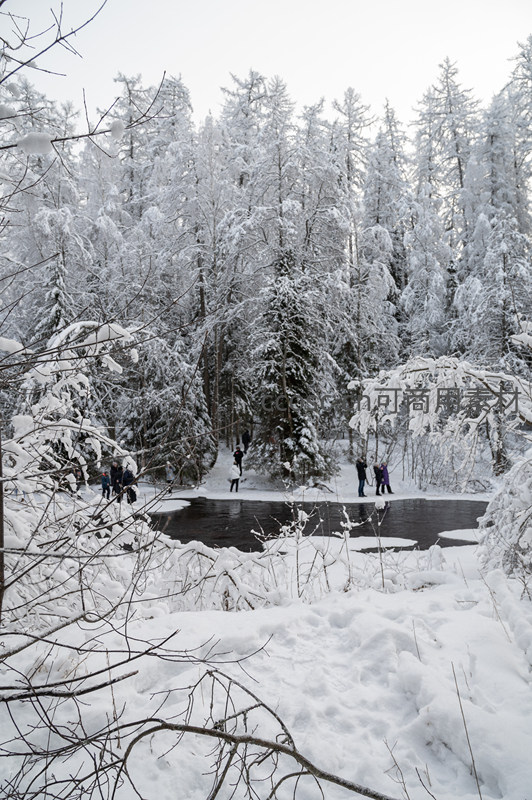 皑皑白雪覆盖的松林环绕着一条未完全结冰的河流,几位游客在岸边驻足欣赏,构成一幅人与自然和谐共处的冬日画卷。