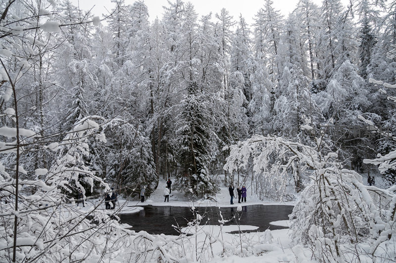 清澈溪流穿行于雪林之间,几位游人驻足观赏,雪覆的枝叶倒映水中,动静相宜,展现人与自然和谐共处的冬日美景。