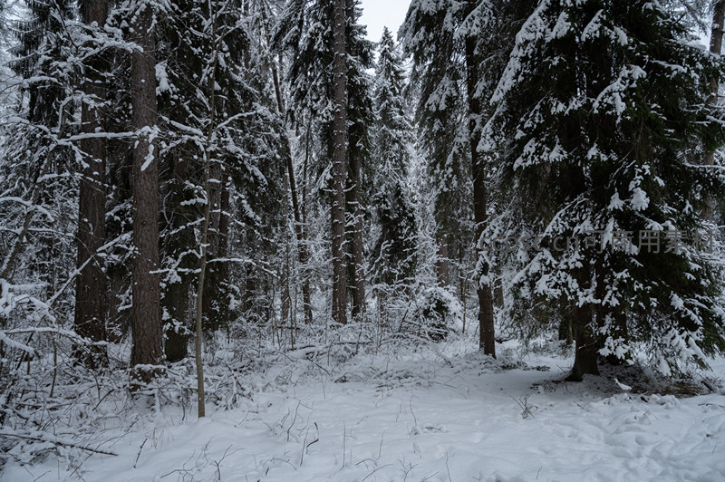 阳光透过稀疏的树枝洒在雪地上,形成斑驳光影。林间小径蜿蜒向前,四周松树挺拔,白雪皑皑,宛如童话世界。