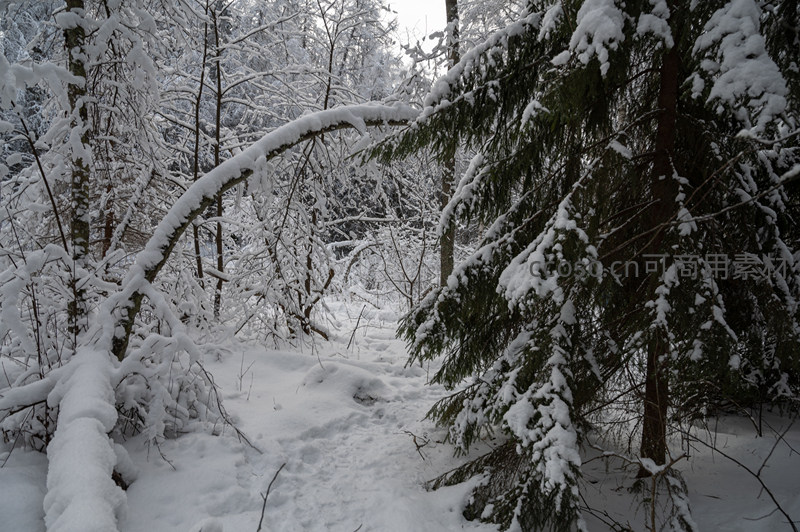 一条被厚雪覆盖的小径在密林中蜿蜒穿行,两侧高大树木披着银装,透露出冬日森林深处的神秘与安宁。