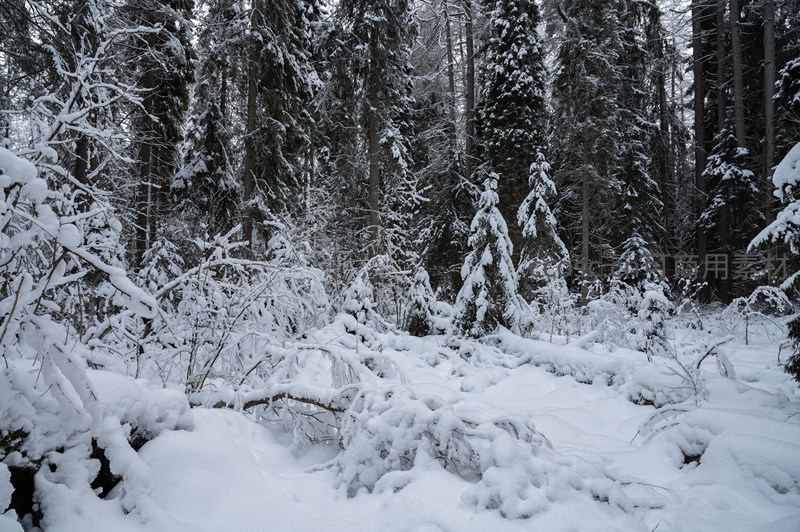 厚厚的积雪压弯了灌木与低矮树枝,整片森林陷入无声的沉寂,只有风偶尔掠过,带来一丝清冽的寒意。