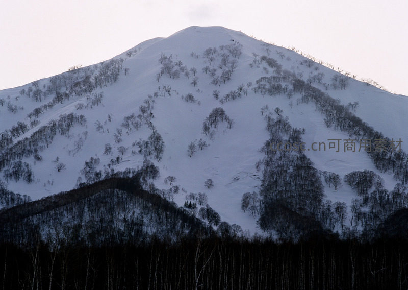 巍峨的雪山覆盖着无垠白雪,山腰间点缀着深色的枯树,前景是浓密的暗色林带,构成一幅苍茫壮阔的冬日画卷。