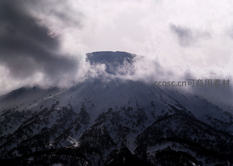 厚重云层如潮水般涌动,半遮半掩着被白雪覆盖的山巅,光线幽暗,氛围神秘,仿佛通往未知仙境的入口。