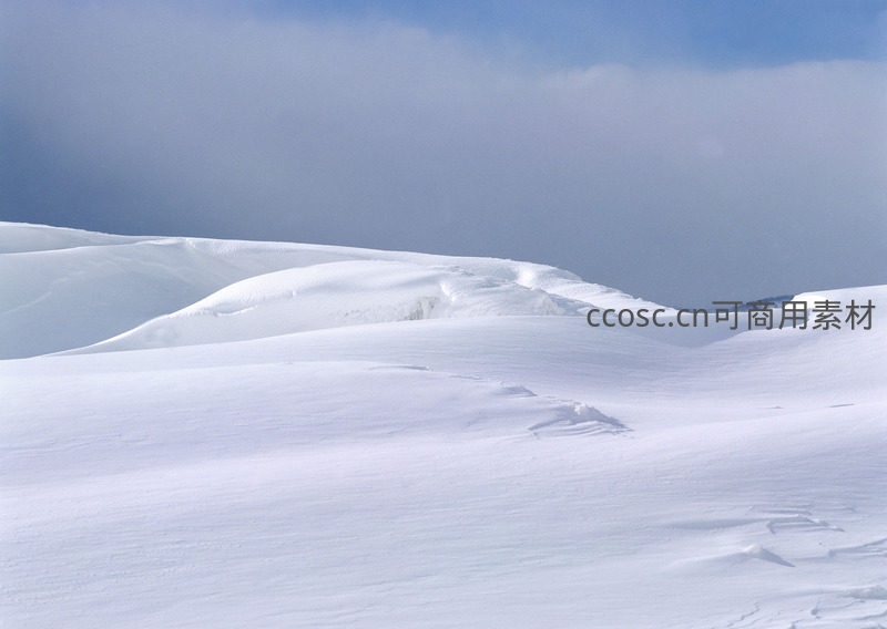 连绵起伏的雪原丘陵在阴沉天空下铺展,洁白无瑕的雪面勾勒出柔和曲线,营造出空旷而宁静的冬日氛围。