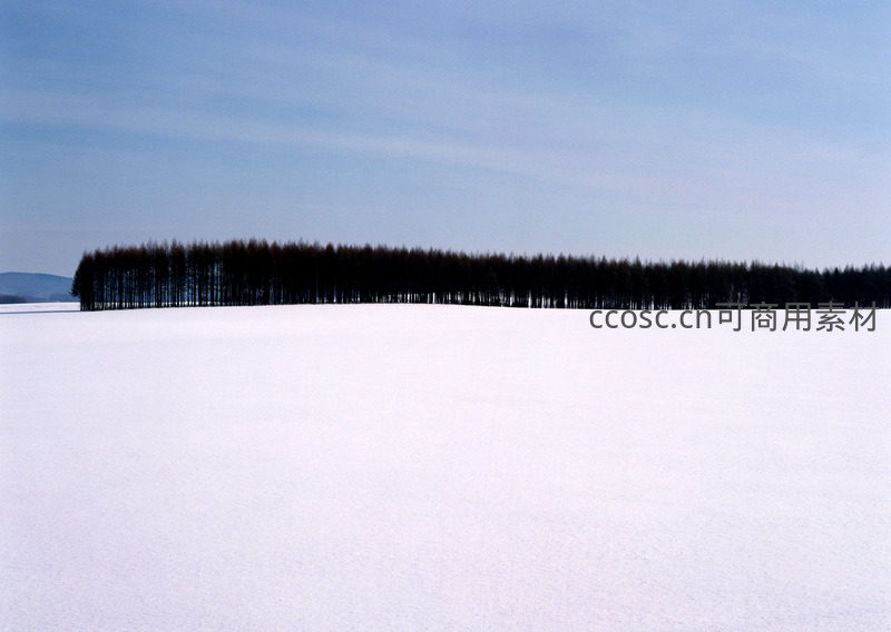 广袤无垠的雪原如一张巨大的白纸,远方一道整齐的树林形成鲜明的水平线,天空澄澈,构图极简,传递出极致的宁静与秩序感。