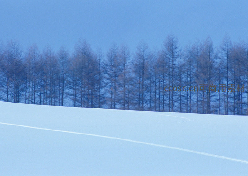 洁白无瑕的雪坡延伸至远方,一排挺拔的树木剪影映衬在清澈的蓝天之下,画面简洁而富有层次感,充满冬日的诗意。