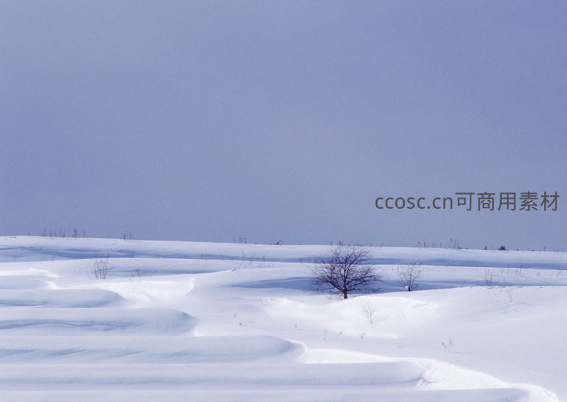 风吹雪塑造成连绵起伏的雪丘,形态如波浪般流畅,一棵孤零零的枯树伫立其间,更显天地苍茫与自然力量的壮阔与冷峻。
