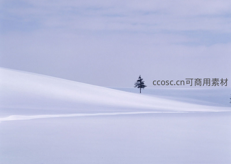 纯白的雪坡斜向延伸,远方一棵挺拔的松树成为视觉焦点,极简的构图与大面积留白,赋予画面深远的禅意与宁静的艺术美感。