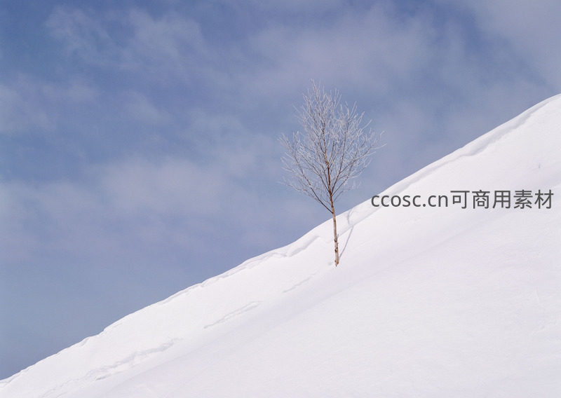 一棵孤零零的树挺立在陡峭雪坡之上,枝头挂满霜花,背景是湛蓝天空,象征着生命在严寒中的顽强。