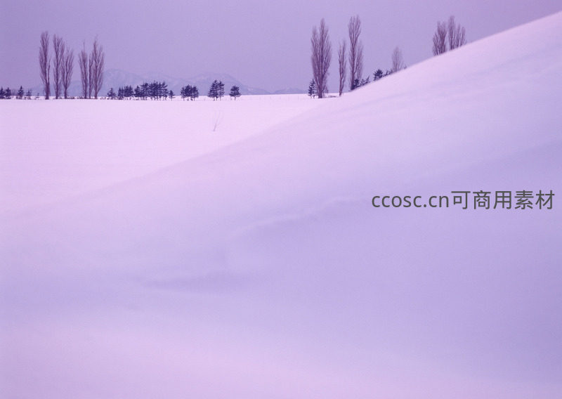 广袤无垠的雪原在暮色中铺展,几株孤树静立于地平线,远山隐约,天地间一片纯净安宁,仿佛时间在此刻凝固。