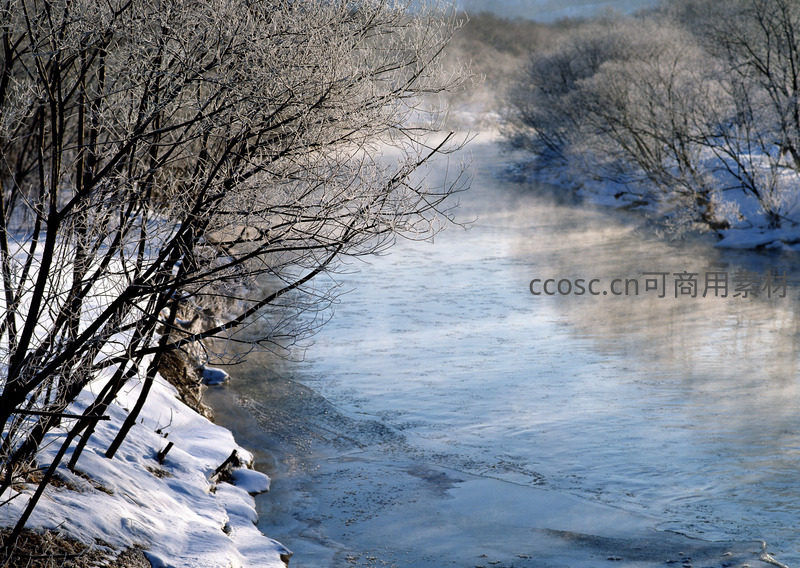 清晨的河面升腾着薄雾,部分河面结冰,两岸积雪覆盖,光秃的枝条在冷冽空气中勾勒出冬日的轮廓。