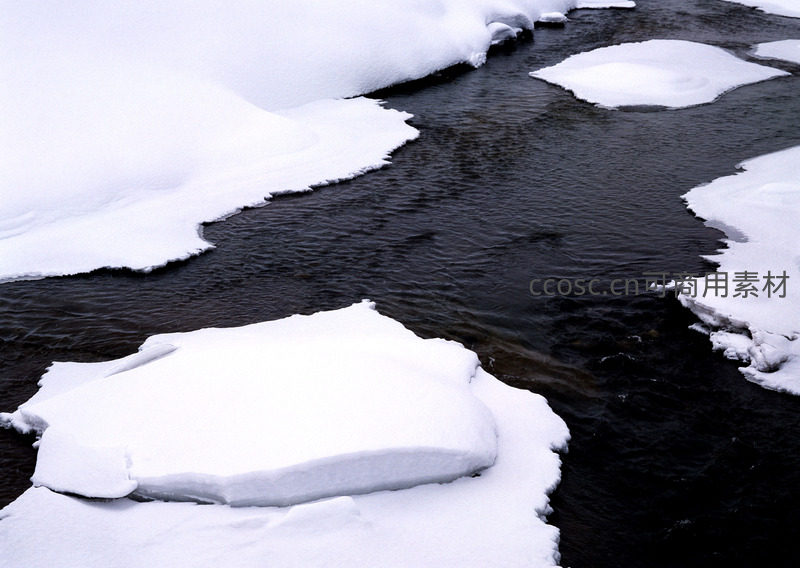 厚厚的积雪覆盖在河中的岩石上,深色的河水从旁静静流淌,形成鲜明对比,展现冬日河流的静谧与力量。