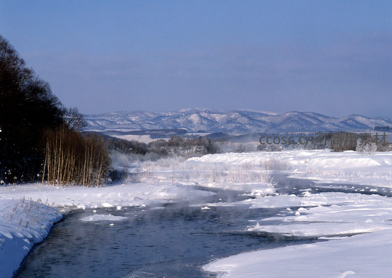 清澈的河流穿越无垠雪原,远方层叠的雪山在湛蓝天空下清晰可见,构成一幅辽阔而纯净的冬日山水画卷。