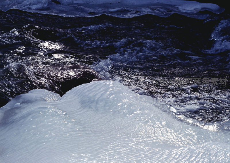 深蓝色的河水在冰封的河岸间奔腾,激起层层白色浪花,冰面纹理清晰,展现冬日河流的磅礴与冷冽之美。