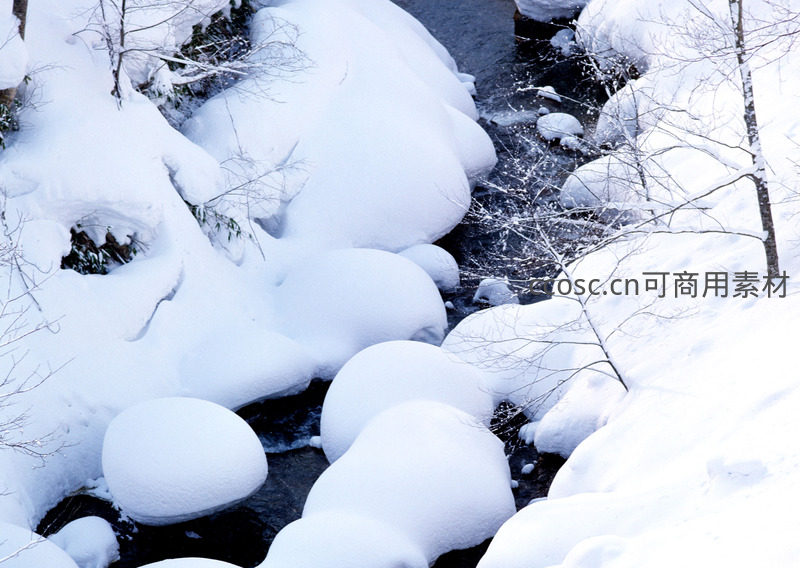 溪水在布满巨大雪球的岩石间轻柔流淌,雪球形态圆润,与清澈水流形成鲜明对比,展现冬日溪谷的童趣与生机。