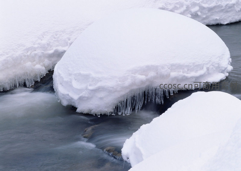 清澈溪水在厚雪覆盖的岩石间流淌,冰凌从雪檐垂下,展现冬日自然静谧之美。