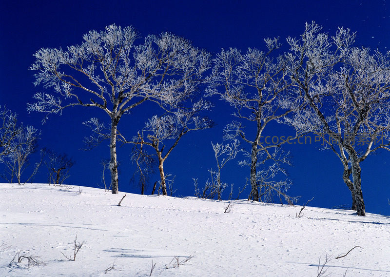 树枝被厚厚的积雪包裹,形成独特的“雾凇”景观,在纯净无云的深蓝天空下,雪白与蔚蓝构成强烈视觉对比,尽显冬日的静谧与壮阔。