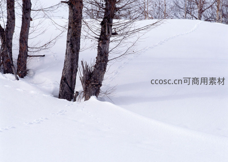 几棵老树的树干深深扎根于厚雪之中,粗糙的树皮与纯净的白雪形成对比。一串细小的足迹从树旁掠过,为这寂静的画面增添了一丝生命的痕迹。