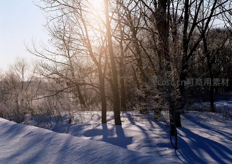 清晨的阳光穿透覆盖着白雪的树林,树影在雪地上拉长,营造出静谧而温暖的冬日氛围。
