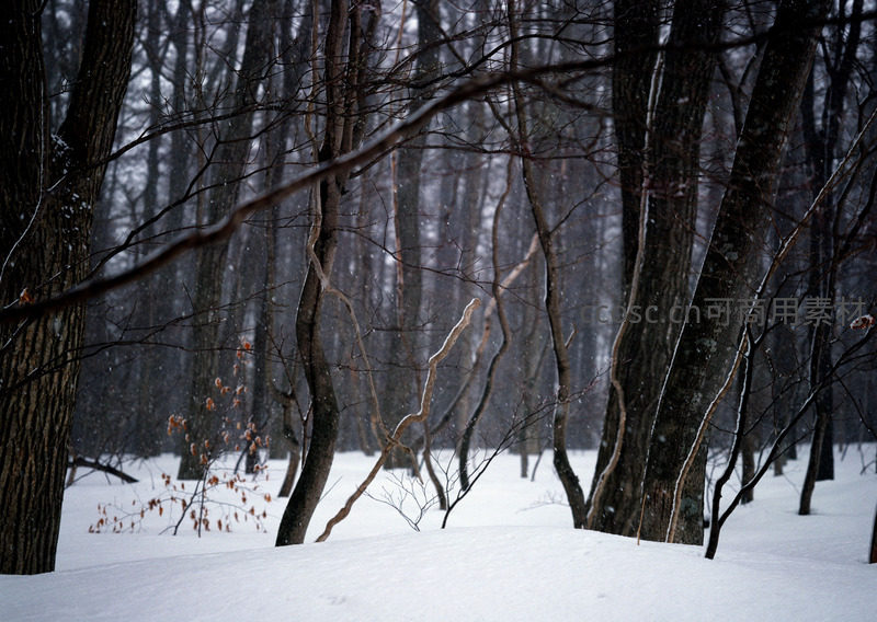 飘雪中的幽深林间小径静谧如画