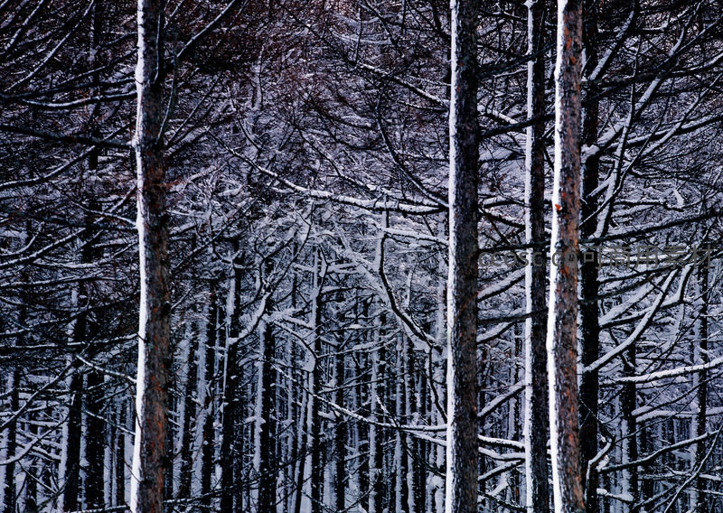 高耸的松树被厚厚的积雪覆盖,枝条交错纵横,在灰蓝色调中透出沉稳与苍劲之美。