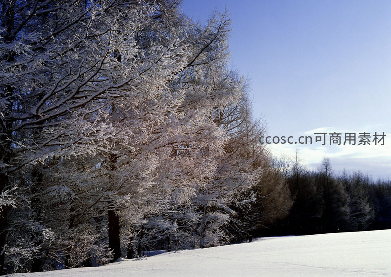 树梢挂满晶莹雾凇,在晴朗蓝天的映衬下熠熠生辉,雪地广阔无垠,尽显北国冬日壮美。