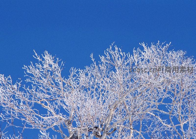 整片树冠被洁白雾凇覆盖,枝条如玉雕般精致,在深邃蓝天下熠熠生辉,营造出童话般的冰雪仙境氛围。