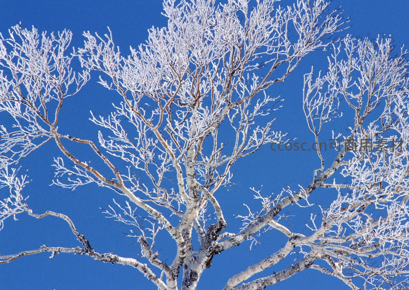 冬季晴空下,树枝挂满晶莹霜花,与湛蓝天空形成强烈对比,展现大自然的纯净与宁静,是冬日风光的经典画面。