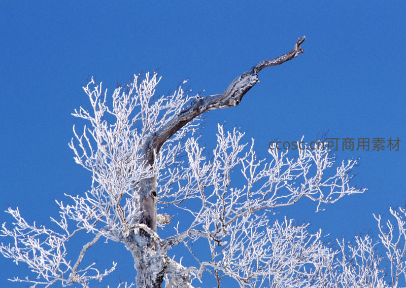一棵形态独特的枯树傲然挺立,枝干扭曲有力,覆盖着薄霜,在无垠的蓝天下展现出生命的坚韧与不屈,充满艺术感和力量感。