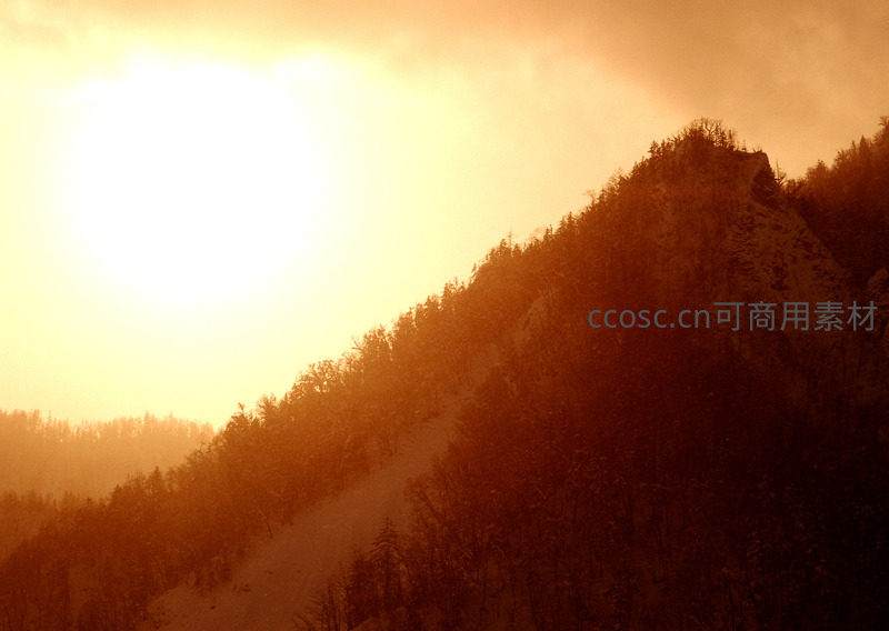 落日余晖将整片雪山与森林染成金色,光影交错间尽显大自然的磅礴气势。温暖色调与冷峻雪景形成强烈视觉冲击。
