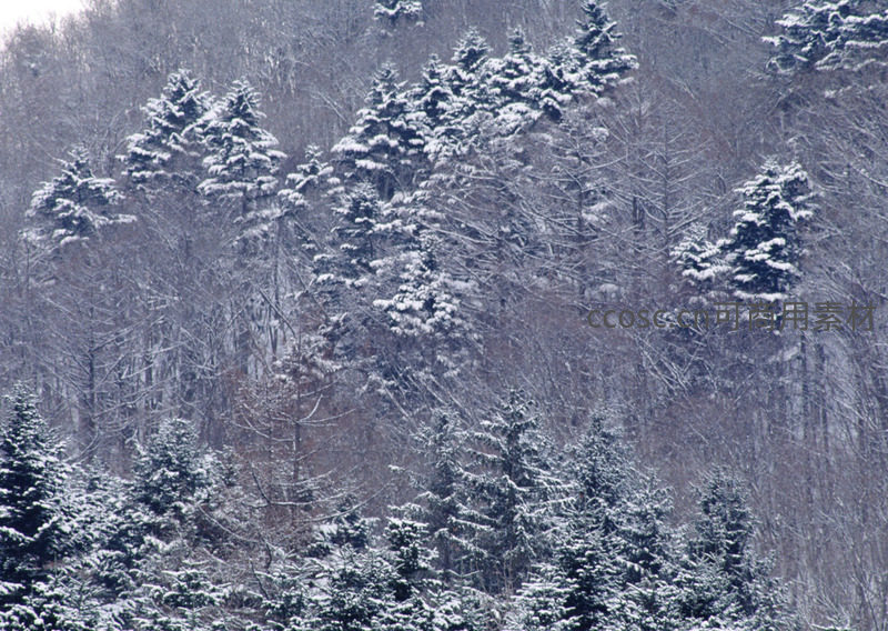 高大的雪松承载着沉甸甸的积雪,却依然昂首挺立。背景落叶林灰白交织,共同描绘出一幅充满生命力的冬日画卷。
