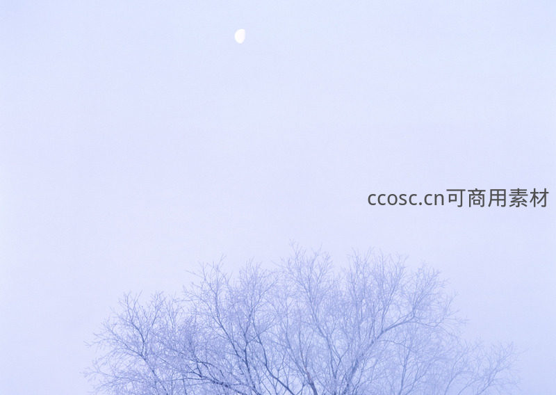 淡紫色雾霭中,一轮明月高悬,光秃的树枝在朦胧背景下形成优雅剪影,营造出空灵寂寥的冬夜意境。