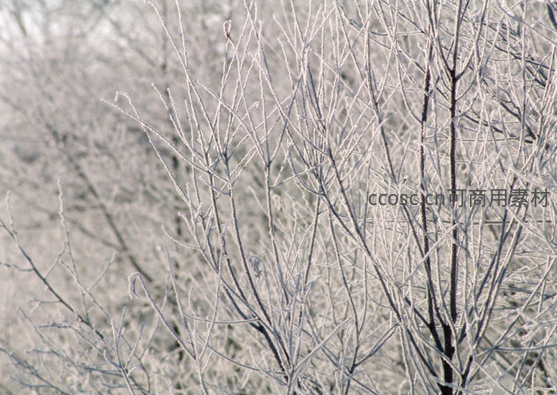 细密的冰晶包裹着每一根枝条,在晨光中闪烁着微光,展现了冬日清晨特有的清冷、纯净与诗意般的视觉美感。
