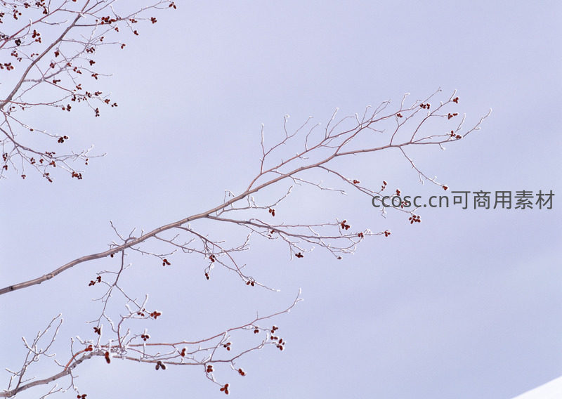 细长的枝条挂满薄霜,点缀着几颗深红色的果实,在淡紫色天空的映衬下,构成一幅极简而富有诗意的冬日清冷画面。