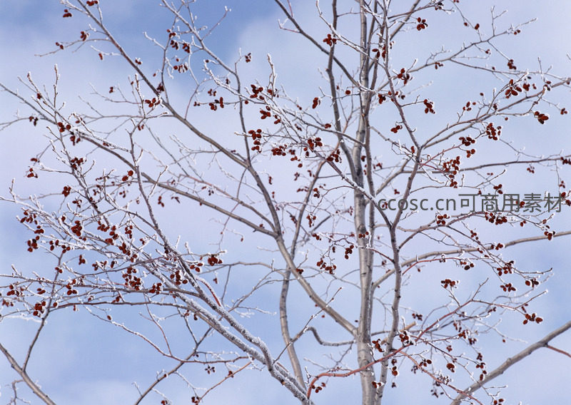 冰晶包裹着光秃的枝条,深红的果实点缀其间,与背后清澈的蓝天形成鲜明对比,展现了冬日里生命顽强与自然奇观的融合。
