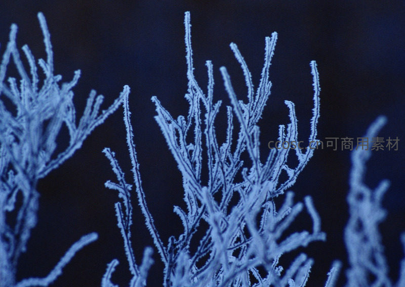 镜头拉近,细小的霜花覆盖在枝条表面,如水晶般剔透,在深蓝背景衬托下更显其精致结构与冬日的寒意。