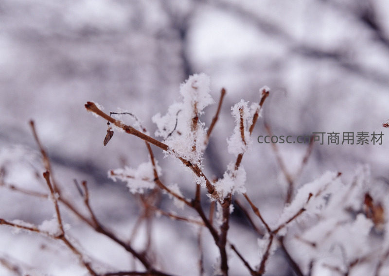 细小的枝杈上积满蓬松的雪花,宛如盛开的白色花朵,在柔和的光线中显得格外温柔,传递出冬日的静美。