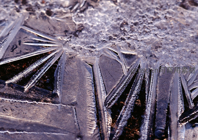 地面上凝结的霜花呈现出精妙的几何图案,尖锐的晶体结构在微光下闪烁,宛如大自然精心雕琢的微型水晶艺术品。