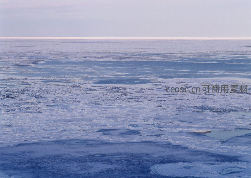 从高空俯瞰,无垠的冰原上布满破碎的浮冰,远处地平线与淡紫色天空相接,展现出极地或高纬度地区特有的宁静与苍茫。