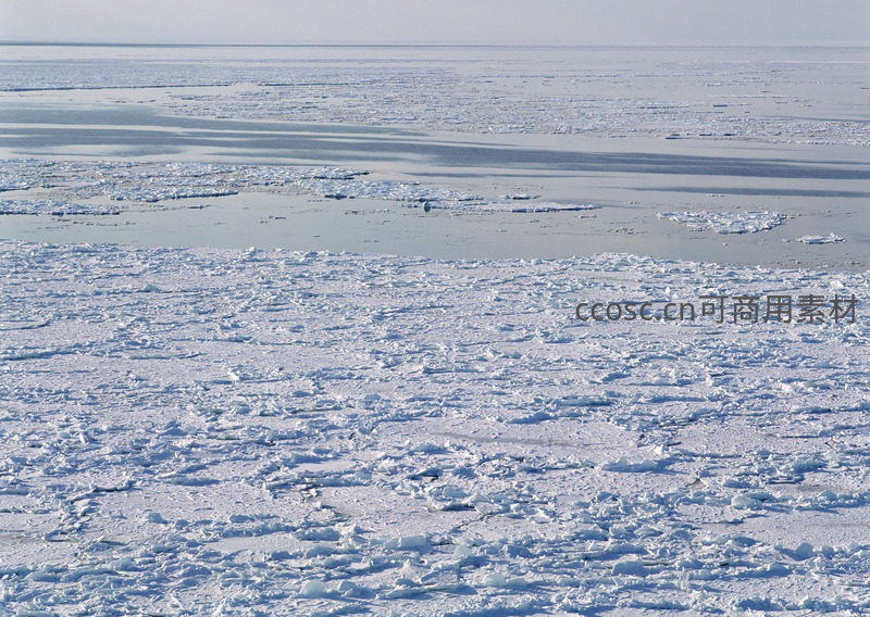 视线延伸至天际,冰封的水域上散布着大小不一的浮冰块,部分区域尚有未冻结的水面,构成一幅辽阔而静谧的冬日画卷。