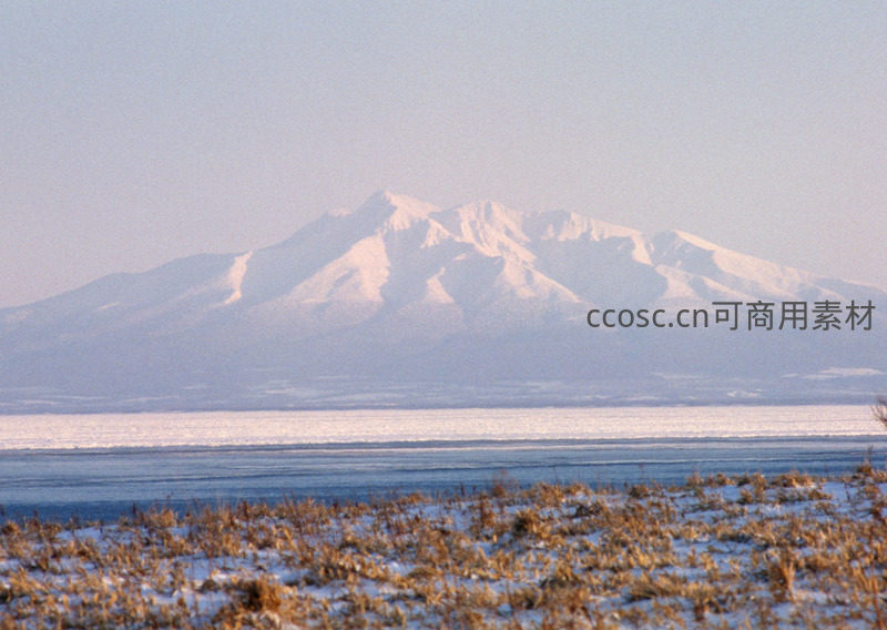 前景是覆盖薄雪的枯黄草地,中景是平静如镜的冰封湖面,远景则是被皑皑白雪覆盖的雄伟山脉,在柔和晨光中共同构成一幅层次分明的冬日静谧画卷。