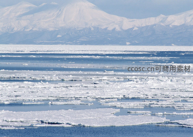 广袤的冰原上漂浮着大小不一的浮冰,背景是连绵的雪山,在阳光下泛着银光,整体色调以冷色为主,展现极地般的纯净与辽阔。