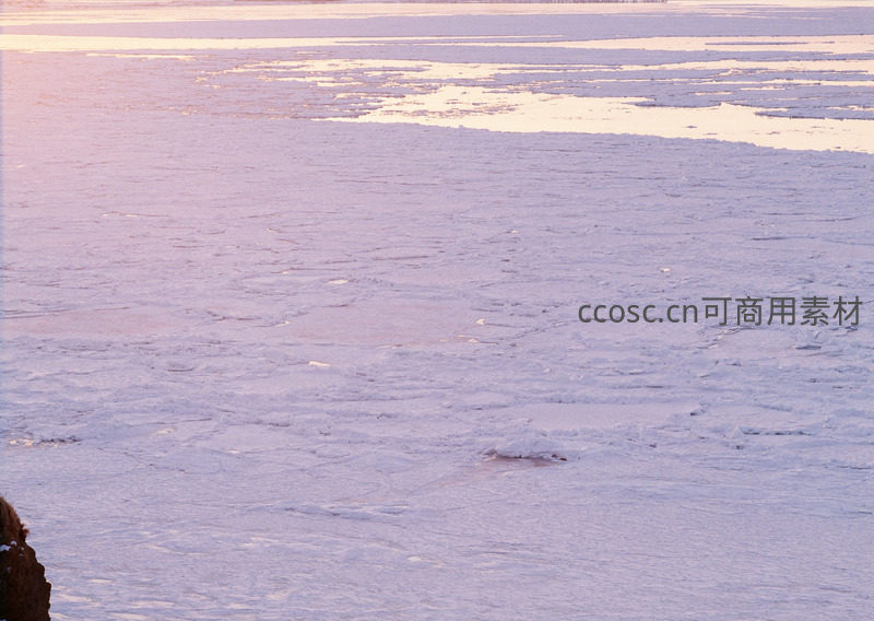 夕阳西下,金色余晖洒在冰封的湖面上,将原本洁白的冰层染成一片温柔的粉紫色,营造出梦幻而宁静的冬日黄昏氛围。